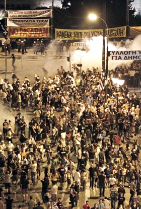 Os trabalhadores se uniram aos jovens acampados há um mês na Praça Syntagma, em uma nova jornada de protestos. Palavras-de-ordem como “não pagaremos a dívida”, “não às medidas de mercados” foram, mais uma vez, a tônica das manifestações. Logo após o início dos protestos, os manifestantes entraram em confronto com a polícia, que reprimiu o ato com gás lacrimogêneo. Ao menos seis manifestantes foram feridos, mas o número pode ser bem maior.