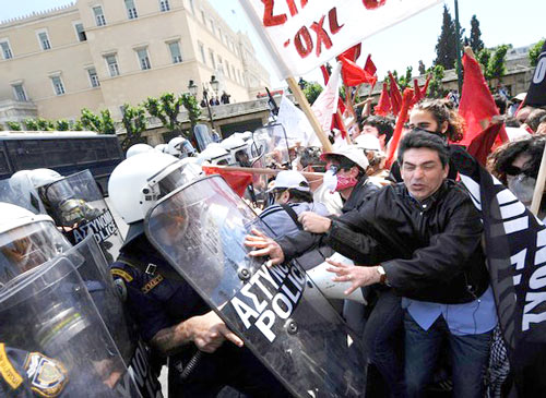 No 1º de maio o governo grego já enfrentou uma série de mobilizações. No dia 3, um grupo de professores e estudantes invadiram um programa de TV ao vivo em Atenas para protestar contra os cortes da Educação. Na manhã desse dia 4, cerca de 200 militantes do Partido Comunista ocuparam a Acrópole, um dos maiores pontos turísticos do país, e fixaram uma enorme faixa convocando a jornada de paralisações e protestos. “Povo da Europa levantam-se” dizia.