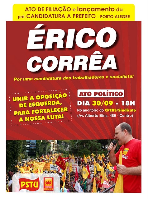 Nesta sexta-feira, dia 30, um grande ato político irá marcar a filiação de Érico Corrêa ao PSTU e o lançamento de sua pré-candidatura a prefeitura de Porto Alegre. O ato está sendo convocado amplamente, de forma conjunta, pelo PSTU e pelo grupo Construção Socialista (CS), que reúne militantes que romperam com o PSOL em abril deste ano, entre eles o próprio Érico.