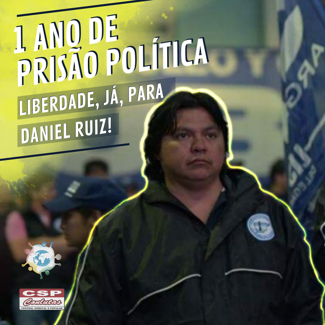 Em 12 de setembro de 2019 se completará um ano da perversa detenção política do petroleiro argentino Daniel Ruiz. Neste dia estão programados atos e mobilizações na Argentina e nas embaixadas do mundo todo! Sua prisão é denunciada pelos movimentos sociais como injusta e ilegal, em meio a tantas outras que o governo de Mauricio Macri realiza contra lutadores e militantes na Argentina, assim como as absurdas perseguições políticas, como ocorre com o ativista Sebastian Romero, a quem Daniel Ruiz também apoiou em diversas campanhas de solidariedade.