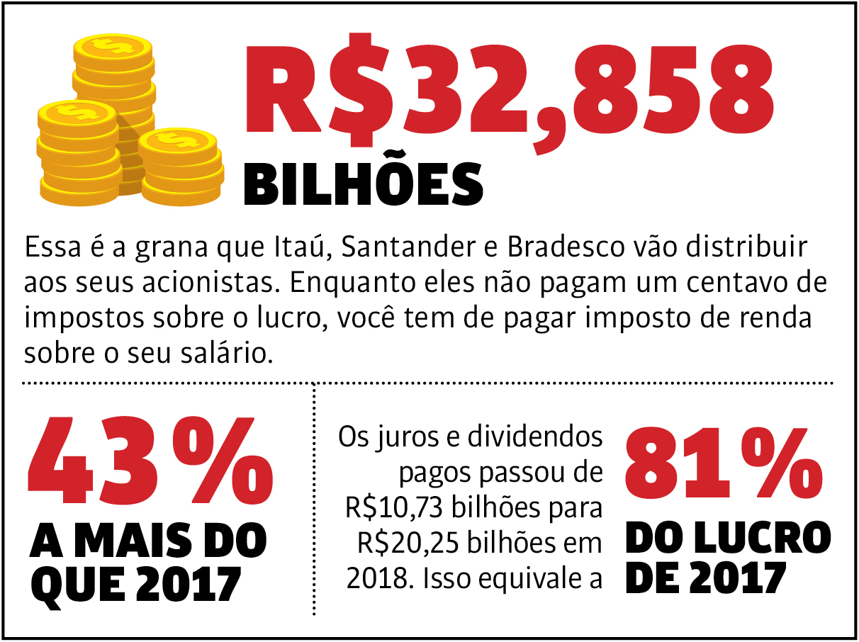 Mesmo quando os bancos não emprestam, eles ganham. Para isso, basta que deixem dinheiro parado no Banco Central. Entre 2014 e 2017, os bancos receberam do governo, a título de juros da chamada “sobra de caixa”, a bagatela de R$ 449 bilhões. Sobra se caixa é o dinheiro que não foi emprestado a ninguém. É aquele mesmo que você depositou na sua conta no banco e não ganhou nada por isso. Pelo contrário, teve de pagar uma tarifa.