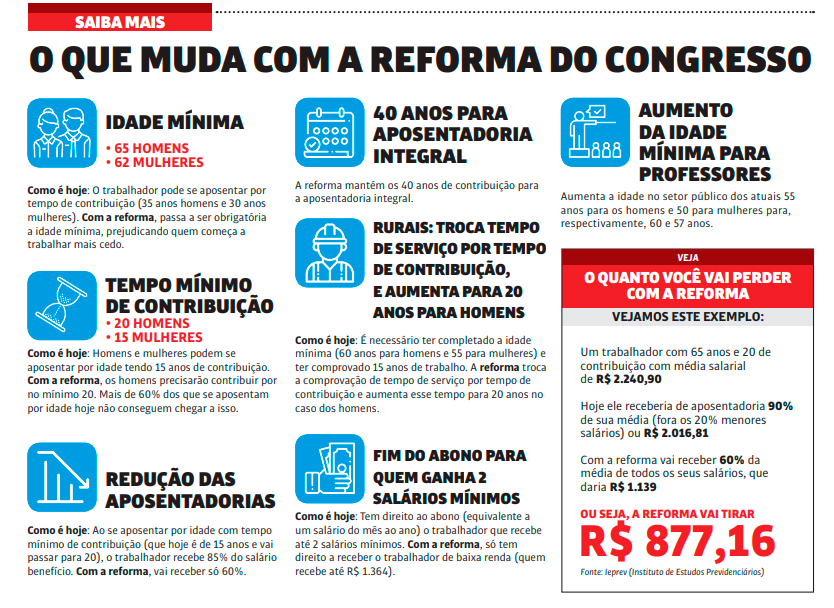 Estão mantidas a idade mínima de 65 anos e o aumento do tempo mínimo de contribuição para 20 anos (no caso dos homens), além da redução da base de cálculo dos benefícios e aposentadoria integral só com 40 anos de pagamento ao INSS. Ou seja, apesar do discurso do governo, continua sendo uma reforma que, caso aprovada, vai excluir do sistema previdenciário grande parte dos trabalhadores, e fazer com que os que conseguirem se aposentar recebam muito menos.