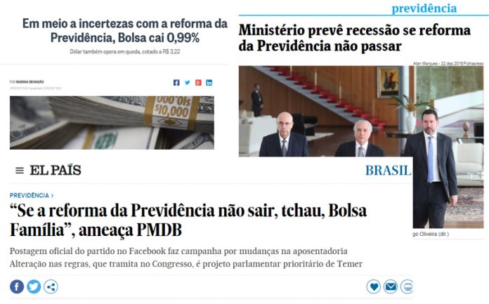 Querem convencer o povo de que, se não for aprovada, haverá um verdadeiro apocalipse no país. E para isso não economizam nas mentiras. O Ministério do Planejamento, por exemplo, está plantando na mídia um “estudo” afirmando que, caso a reforma não seja aprovada, o Brasil voltaria à recessão em 2019. Resta saber quando exatamente saímos dela. Bem, o levantamento do governo Temer afirma que esse cenário provocaria uma redução do PIB per capita (a riqueza que o país produz em um ano dividido pela população) de R$ 1.400 em 2019 e de R$ 1.800 em 2020. Chega a cogitar perda média de R$ 3.700 na renda dos brasileiros nos próximos três anos.