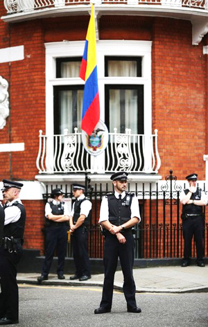 O governo britânico ameaça recorrer a uma obscura lei de 1987 que permitiria a revogação da imunidade diplomática de representações estrangeiras, possibilitando assim a entrada da polícia na embaixada equatoriana. O chanceler do Reino Unido, William Hague, negou que o país estivesse prestes a invadir a embaixada, mas reiterou que não concederá o salvo-conduto para que Assange possa sair do país sem ser detido. Ao mesmo tempo, mandou policiais para a entrada da representação diplomática. Na prática, a Inglaterra se nega a reconhecer o asilo concedido pelo Equador ao fundador do WikiLeaks.