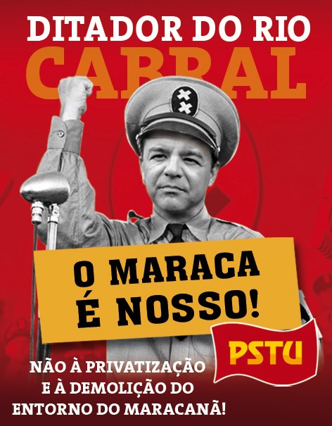Em defesa da Aldeia Maracanã e do Estádio de Atletismo Célio de BarrosOs cerca de 3 bilhões de lucro que esperam os empresários com a privatização do Maracanã estão pressionando nosso ditador Cabral a ousar na repressão à população carioca e fluminense. O governo quer destruir um prédio histórico de relevante importância para preservação da cultura indígena, uma escola pública considerada modelo, um complexo esportivo fundamental para os atletas e a comunidade do bairro que o utiliza para atividades esportivas, a fim de supostamente atender as exigências da Fifa. Tudo isso acontece com apoio de Eduardo Paes e Dilma, omissos diante do sofrimento dos trabalhadores que perderam seus empregos, dos alunos que perderam sua escola, e dos atletas que não têm mais lugar onde treinar.
