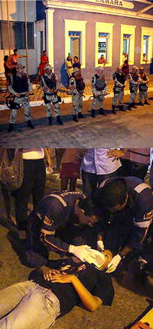 Não satisfeitos em expulsar os manifestantes da Câmara, os policiais ainda retiraram à força os trabalhadores que permaneciam protestando no meio da rua e numa praça em frente ao prédio da Câmara. A enfermeira e dirigente sindical, Simone Dutra, questionou a ação truculenta da polícia. “Cadê a Constituição? Mostre a lei que diz que eu não posso ficar na rua”. A resposta do policial demonstrou, claramente, a situação que vive o município: “Quem manda aqui é a polícia”. Um policial também tentou quebrar a câmera do jornalista do sindicato, que filmava toda a violência. Até mesmo o efetivo policial de municípios vizinhos foi acionado para reprimir a manifestação.