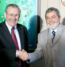 O secretário de Defesa dos Estados Unidos, Donald Rumsfeld, foi recebido na manhã de hoje em Brasília, pelo presidente Lula e pelo vice-presidente e ministro da Defesa, José Alencar. Rumsfeld elogiou o papel do Brasil à frente da ocupação do Haiti. “É o exemplo do papel do Brasil no mundo e na região“, disse o secretário, cuja agenda na América Latina inclui países que fazem parte da missão da ONU no Haiti. Rumsfeld visitou a Argentina e, do Brasil, segue para a Guatemala.