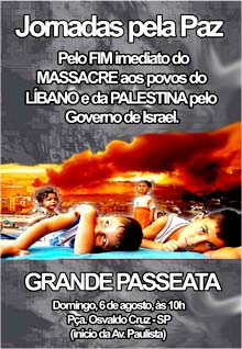 Uma grande passeata exigirá o imediato fim dos ataques de Israel ao Líbano e à Palestina, na manhã do dia 6 de agosto, domingo, na capital paulista. Organizado pelo Comitê de Solidariedade aos Povos Árabes, constituído por 80 entidades da comunidade libanesa no Brasil além de organizações dos movimentos sociais, entre elas a Conlutas, a passeata demonstra o crescimento das manifestações de repúdio contra o Estado terrorista de Israel, além da solidariedade aos povos árabes massacrados.