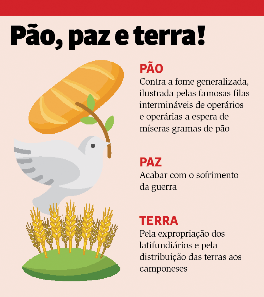 | SAIBA MAIS: Governo provisório Foi o governo que se estabeleceu na Rússia após a queda do tzar Nicolau II em fevereiro de 1917. Com o populista de esquerda Kerensky à frente, era composto por partidos burgueses e, depois de maio, pelas maiores correntes de esquerda, como os mencheviques e os Socialistas Revolucionários. Sua função seria a de governar até a convocação de uma assembleia constituinte para a composição de um Estado burguês no país. Porém o poder de fato estava já nas mãos dos sovietes, que controlavam fábricas, estradas, ferrovias etc. |