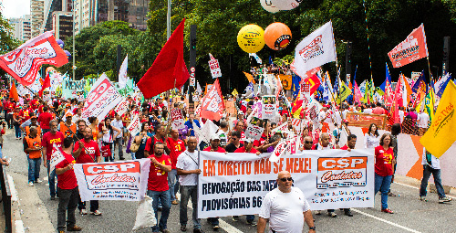 Parte do Dia Nacional de Lutas por Empregos e Direitos, na manhã desta quarta, 28, cerca de três mil pessoas marcaram presença na Av. Paulista, centro financeiro do país, contra as Medidas Provisórias 664 e 665 editadas pela presidente Dilma no final de 2014 e que, entre outras coisas, ataca direitos como o seguro-desemprego e pensão por morte.