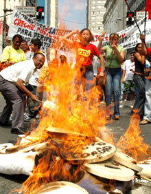 Ao final do ato, o carro de som da Conlutas anunciou a queima dos bonecos do Lula e do Dr. Hélio, juntando grande número de populares, que apoiaram esta iniciativa cantando junto com palavras de ordem como “Ô Lula, que papelão, o seu governo tá pagando mensalão“.