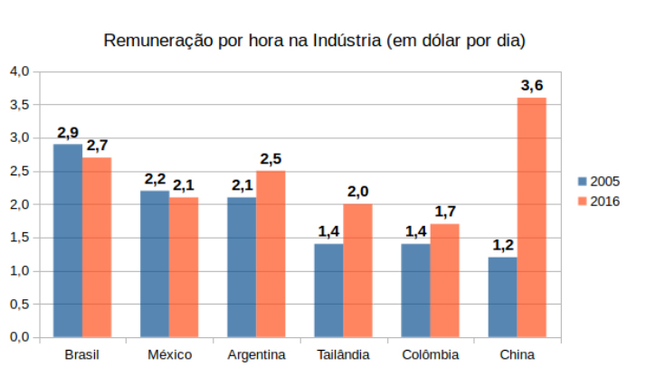 Os empresários e seus representantes dizem que o problema do desemprego no Brasil é o suposto alto custo dos salários. No entanto, essa mentira cínica não resiste um segundo. Além de baixos em geral, a tendência do salário médio no Brasil é de queda no último período. O salário médio na indústria, por exemplo, caiu de 2,9 dólares a hora em 2005 para 2,7 dólares a hora em 2016. É até menor que o da China, de 3,6 dólares a hora.