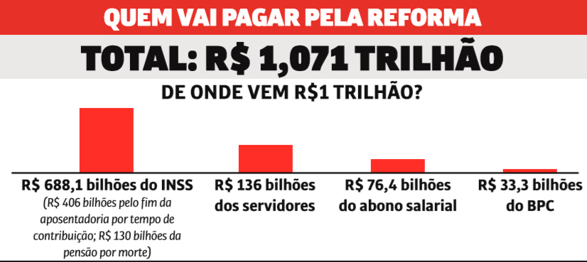 A economia esperada com o projeto é de R$ 1,071 trilhão em dez anos. Desses, R$ 688,1 bilhões sairão de trabalhadores do INSS. A reforma acaba com a aposentadoria por tempo de contribuição, impõe idade mínima e, principalmente, reduz em muito as aposentadorias dos mais pobres. Ainda tira da Constituição as regras para se aposentar, facilitando ataques futuros à Previdência.