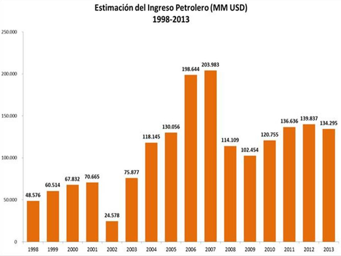 Por outro lado, há dados inquestionáveis como o fato de que em 15 anos ingressaram no país por volta de um trilhão e 800 bilhões de dólares na figura de exportações petroleiras. Em 2007, por exemplo, ingressou 203 bilhões de dólares. O gráfico abaixo demonstra esses ingressos. Para ter acesso a esse dado é toda uma guerra.