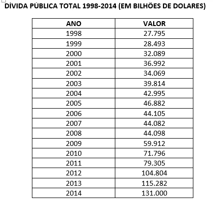 A enorme diferença nas informações prestadas pelo ex-Ministro Giordani e as do gráfico acima expressam a camuflagem dos dados econômicos de um modo geral, e em particular os referentes à dívida pública. De fato, podemos afirmar que nos próximos 10 anos só de serviço da dívida deverão serem pagos 90 bilhões de dólares, além dos 150 ou 180 bilhões de dólares da dívida já existente.