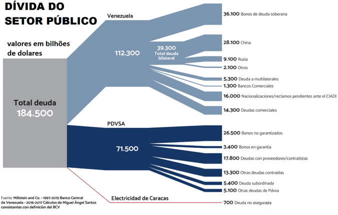 A dívida pública venezuelana, contraída a nível nacional e internacional, nos dezoito anos de governo chavista-madurista, cresceu 5 ou 6 vezes. Em 1998 era da ordem de 30 bilhões de dólares. Hoje os dados mais conservadores falam em 150 bilhões e enquanto outros dados expressam 184 bilhões. Uma questão relevante é por que tamanha diferença? Os dados fornecidos pelo governo, desde 2015, são camuflados de diversas formas. Mesmo assim, pesquisadores independentes, conseguiram dimensionar de forma aproximada o valor da dívida.