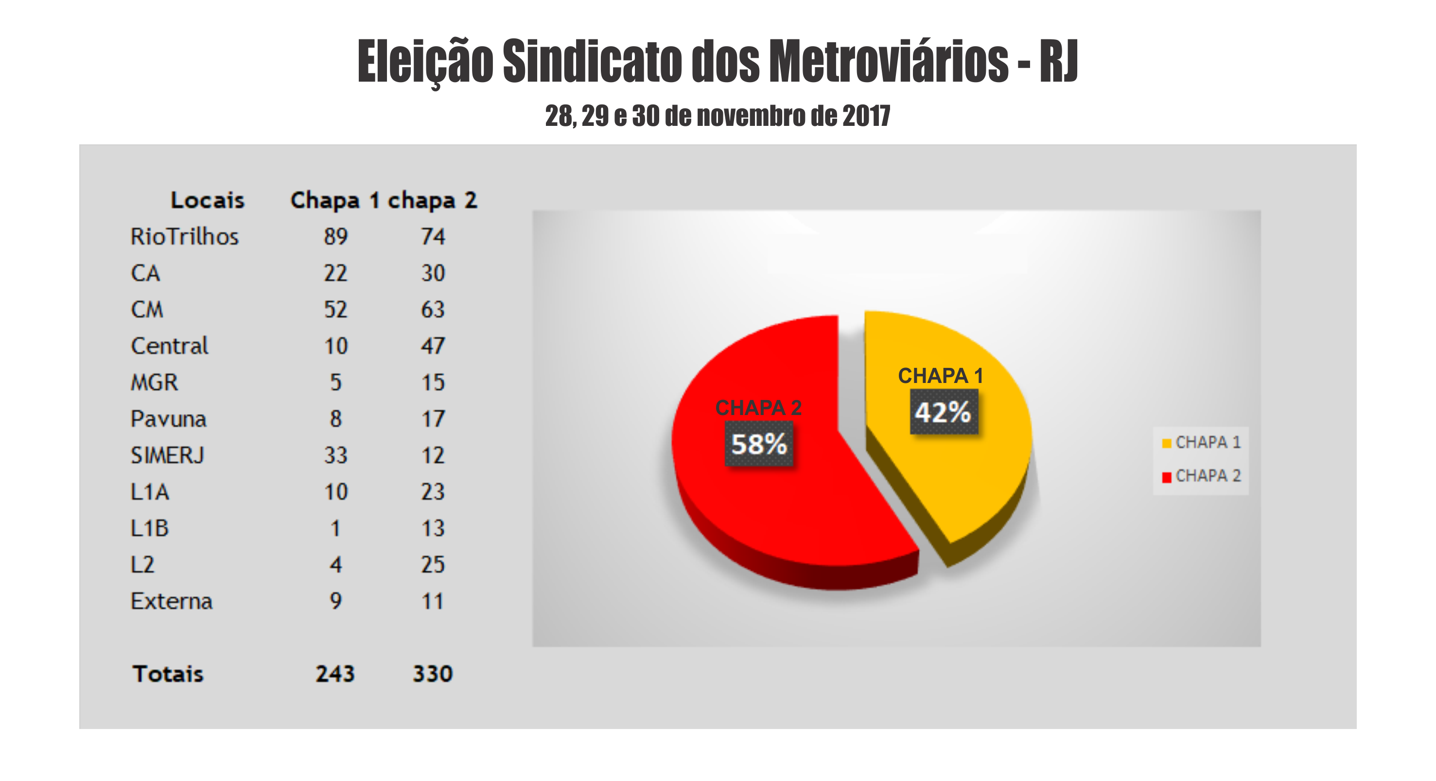 Os trabalhadores que construíram, contra todas as manobras da burocracia que dirigia o sindicato, a Oposição Chapa 2 estão de parabéns. Mostraram que é possível apresentar à categoria uma alternativa de direção de luta para o SIMERJ. Uma direção que vai garantir a independência de classe. Também estão de parabéns cada um dos trabalhadores que votou nessa chapa. Sabemos que havia muita simpatia da direção, tanto da MetroRio quanto da RioTrilhos, em relação à Chapa 1.